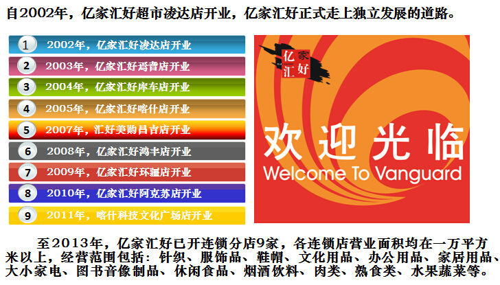 億家匯好商貿(mào)有限責(zé)任公司于2002年成立,并從臺灣引進(jìn)連鎖經(jīng)營職業(yè)管理團(tuán)隊,統(tǒng)一管理旗下各地的連鎖超市。公司通過多年的穩(wěn)健發(fā)展,至2013年底,億家匯好商貿(mào)有限責(zé)任公司已成為擁有員工近3000多人,下轄一個配送中心和9家連鎖超市的大型綜合性零售企業(yè)??偨?jīng)營面積11萬多平方米,配送中心輻射公司所有超市,年配送額可達(dá)2億元。公司大量吸納下崗職工,經(jīng)過崗前培訓(xùn),提高勞動技能,實(shí)現(xiàn)了他們的再就業(yè),為維護(hù)社會和諧穩(wěn)定做出了貢獻(xiàn)。2013年,巴州億家匯好商貿(mào)有限責(zé)任公司在自治區(qū)零售業(yè)中穩(wěn)踞前三位,是自治區(qū)重要的流通龍頭企業(yè),2013年年銷售收入達(dá)10億人民幣。多年來,公司一直重管理、抓實(shí)效、運(yùn)用先進(jìn)的管理手段和營銷理念,秉承億家匯好人 時時尋求效率創(chuàng)新,事事講究專業(yè)技術(shù)的文化精髓,創(chuàng)造了良好的經(jīng)濟(jì)效益和社會效益。公司先后多次被消費(fèi)者協(xié)會評為誠信單位,并多年被評為重合同,守信用單位。